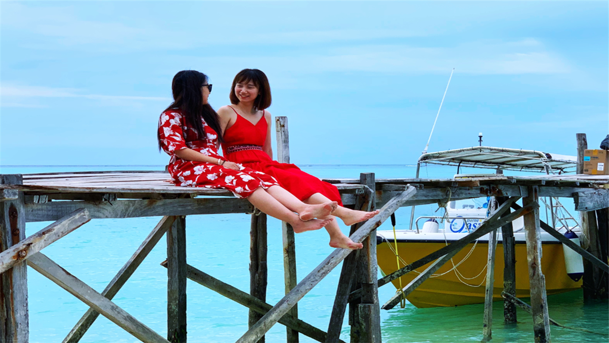 2019年暑期天津公司集体去马来西亚沙巴年度旅游,两位公司市场经营处的小姐姐正坐在码头悠闲地聊天。